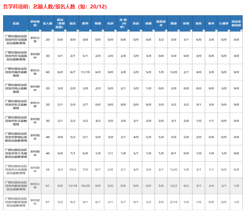 > 2022年广西河池特岗教师计划招聘465名岗位表